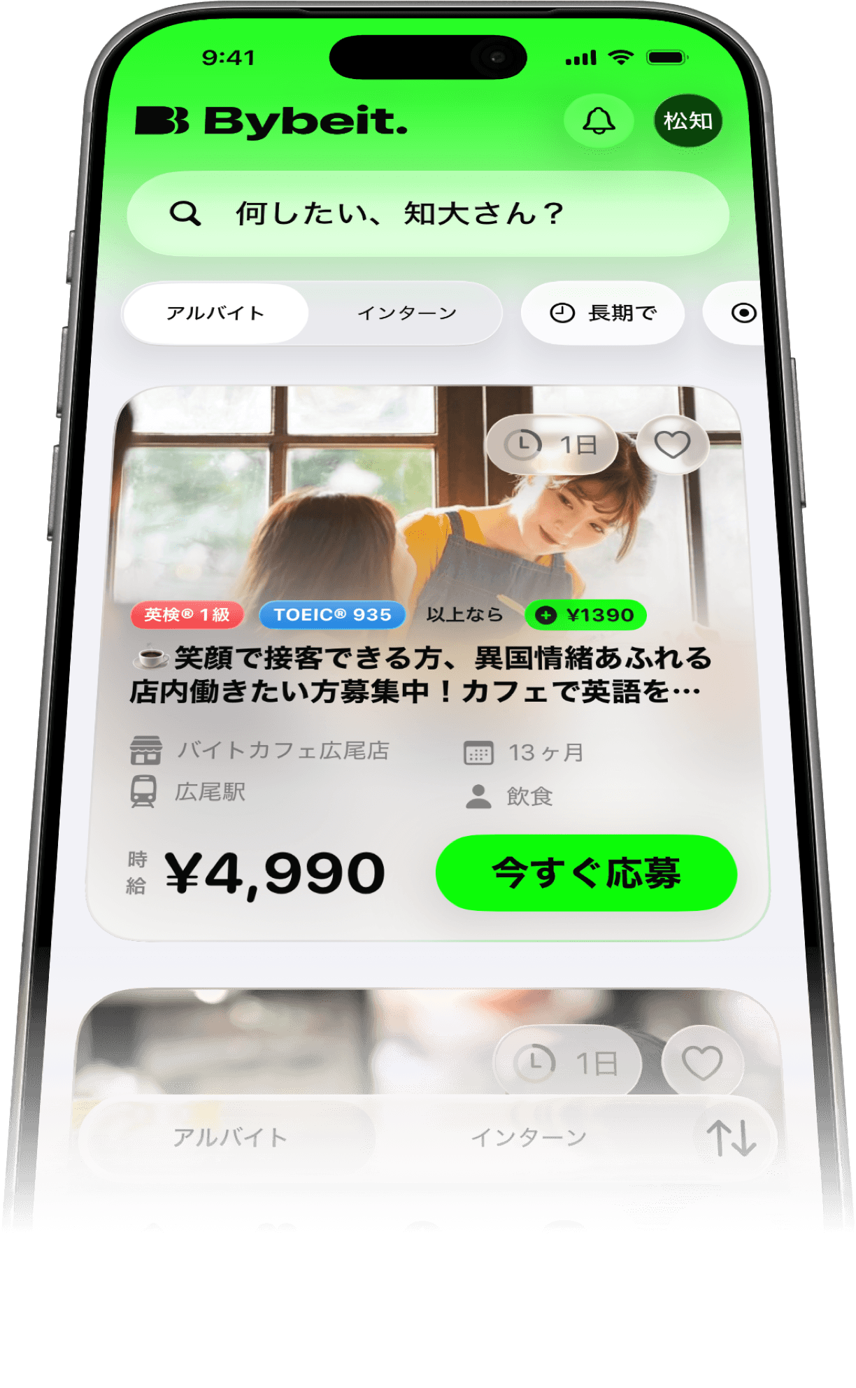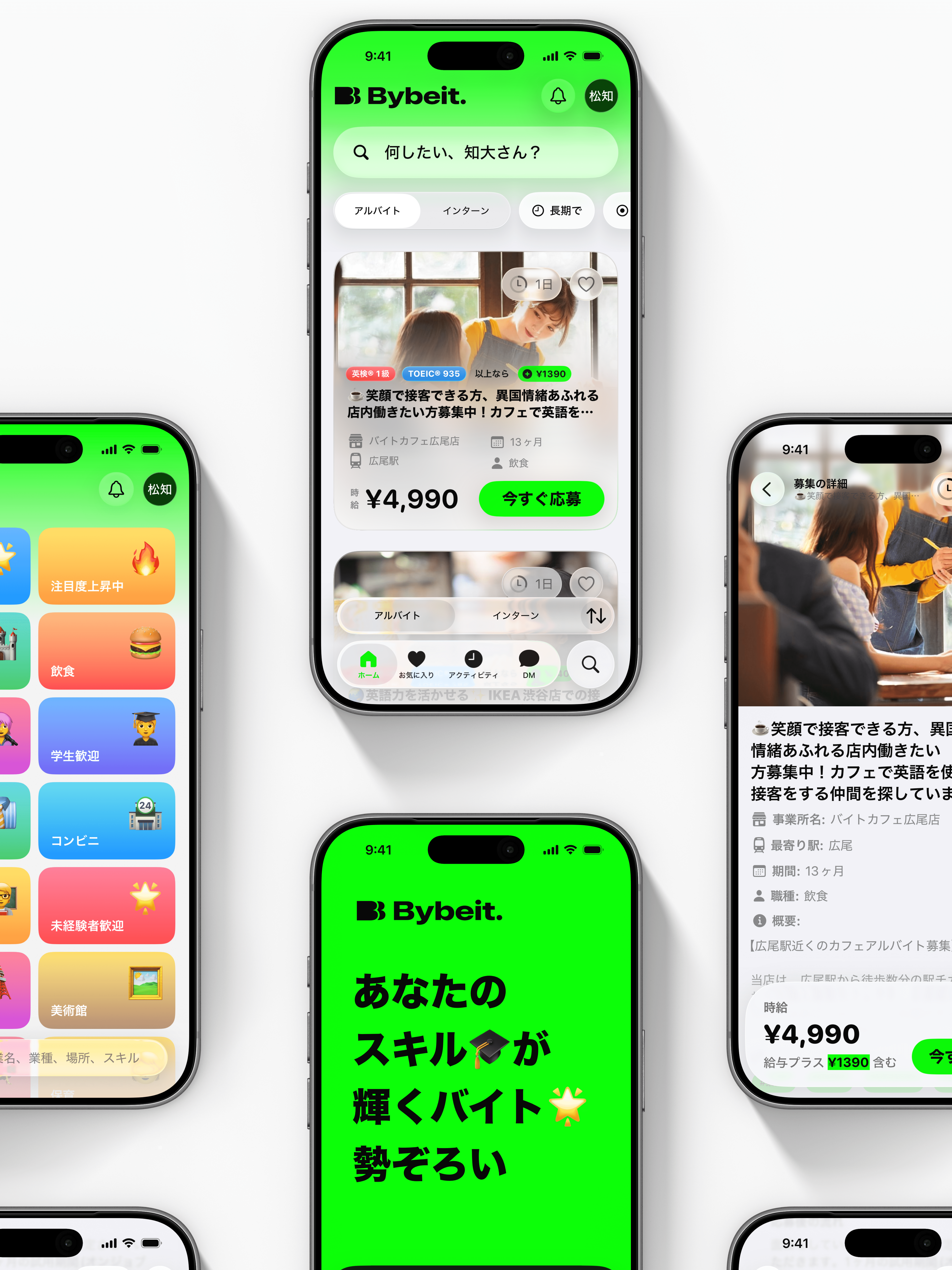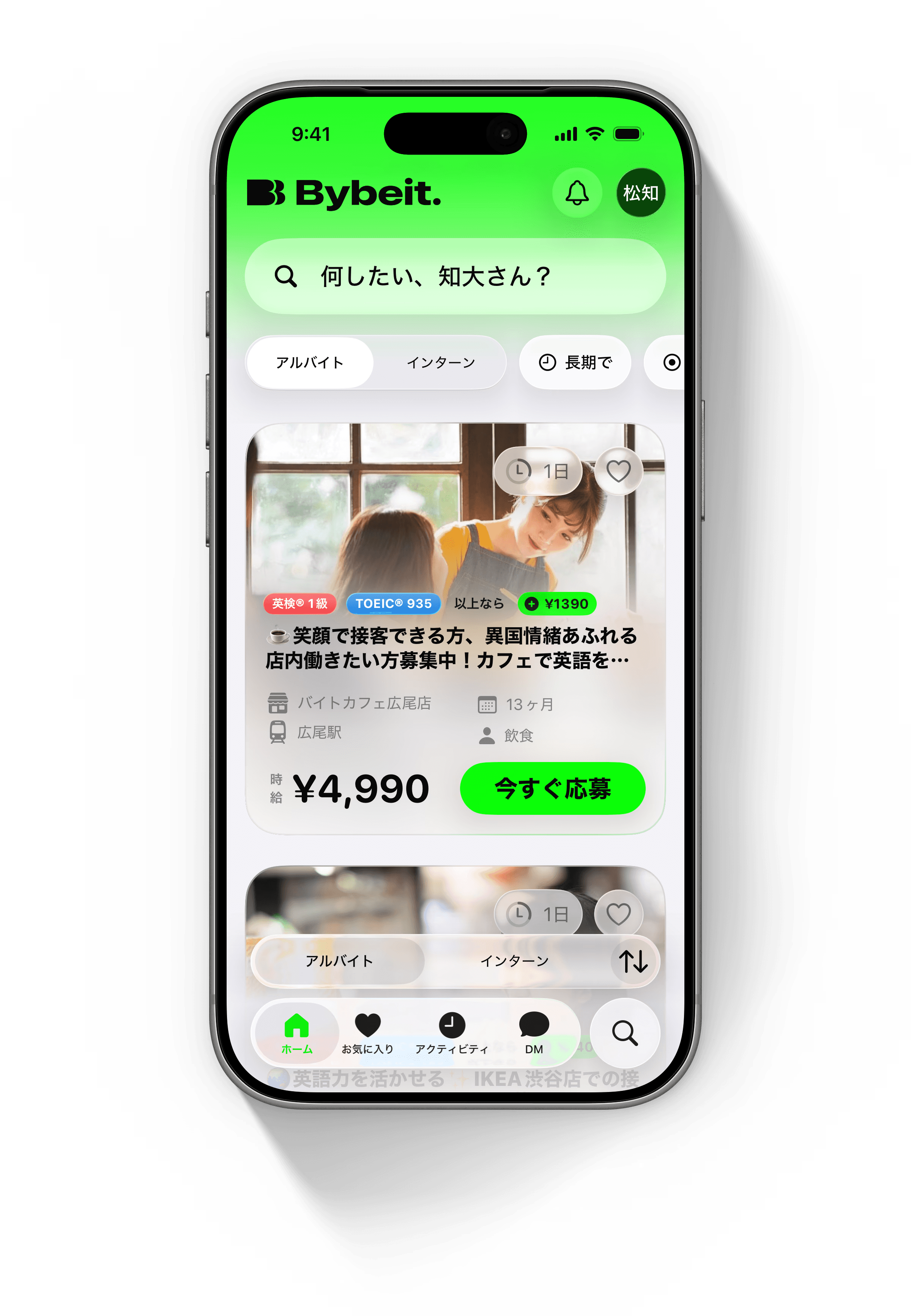 条件・スキル・志向性に合った学生へ直接アプローチできるため、ミスマッチを抑え、採用後の定着率向上にも貢献します。バイト探しから採用までを一つのアプリで完結させ、これまでにないスマートな人材確保を実現します。