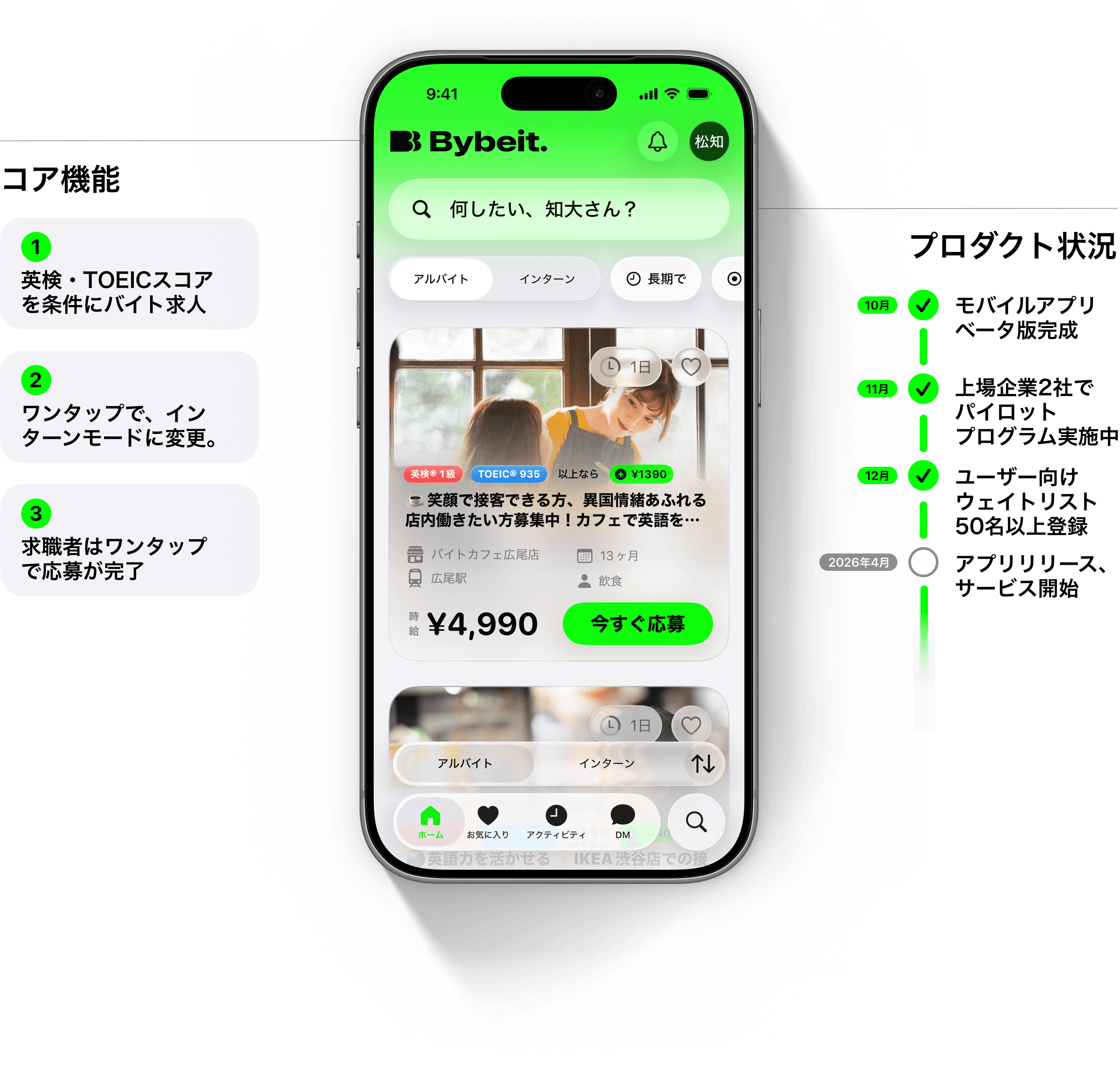 作ったのは、大学生の入学から就活までをカバーする求人のトータルソリューション。一つのアプリ、同じプロフィールでアルバイト・インターンを掲載企業様とマッチします。